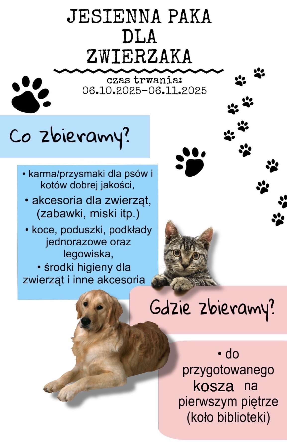 ruszamy z akcją „JESIENNA PAKA DLA ZWIERZAKA”.🐶🐱 Bardzo prosimy wszystkich, którzy chcą i mogą wesprzeć zwierzaki❤️, którymi opiekuje się Głogowskie Stowarzyszenie Pomocy Zwierzętom Amicus, o składanie darów do przygotowanego kosza na pierwszym piętrze.🙂 Szczególnie potrzebne są środki higieniczne, ale też inne rzeczy wskazane na plakacie.💕