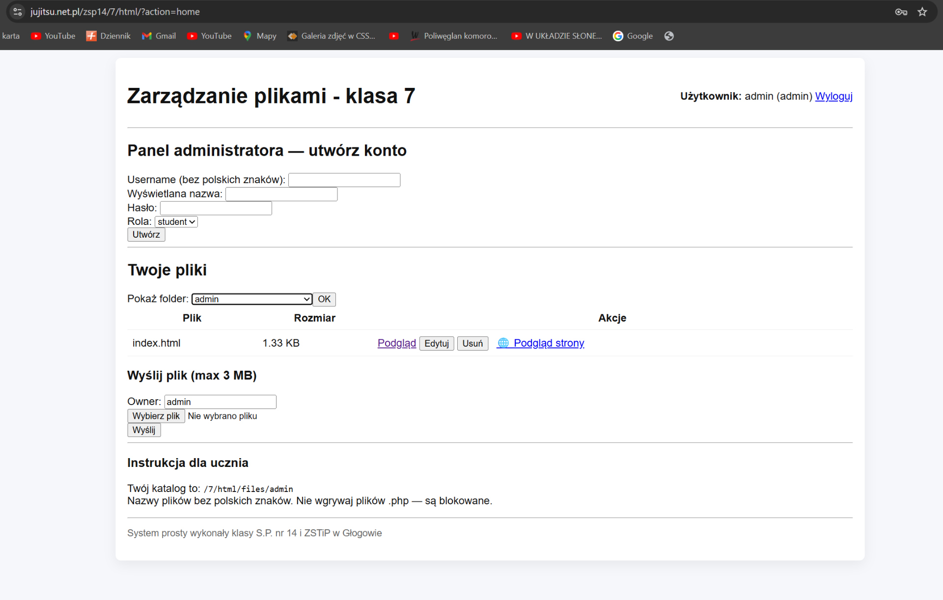 Celem przedsięwzięcia było stworzenie funkcjonalnego systemu internetowego umożliwiającego uczniom logowanie się, przesyłanie plików oraz – co stanowiło kluczowy element projektu – edycję i podgląd przesyłanych plików z kolorowaniem składni kodu.