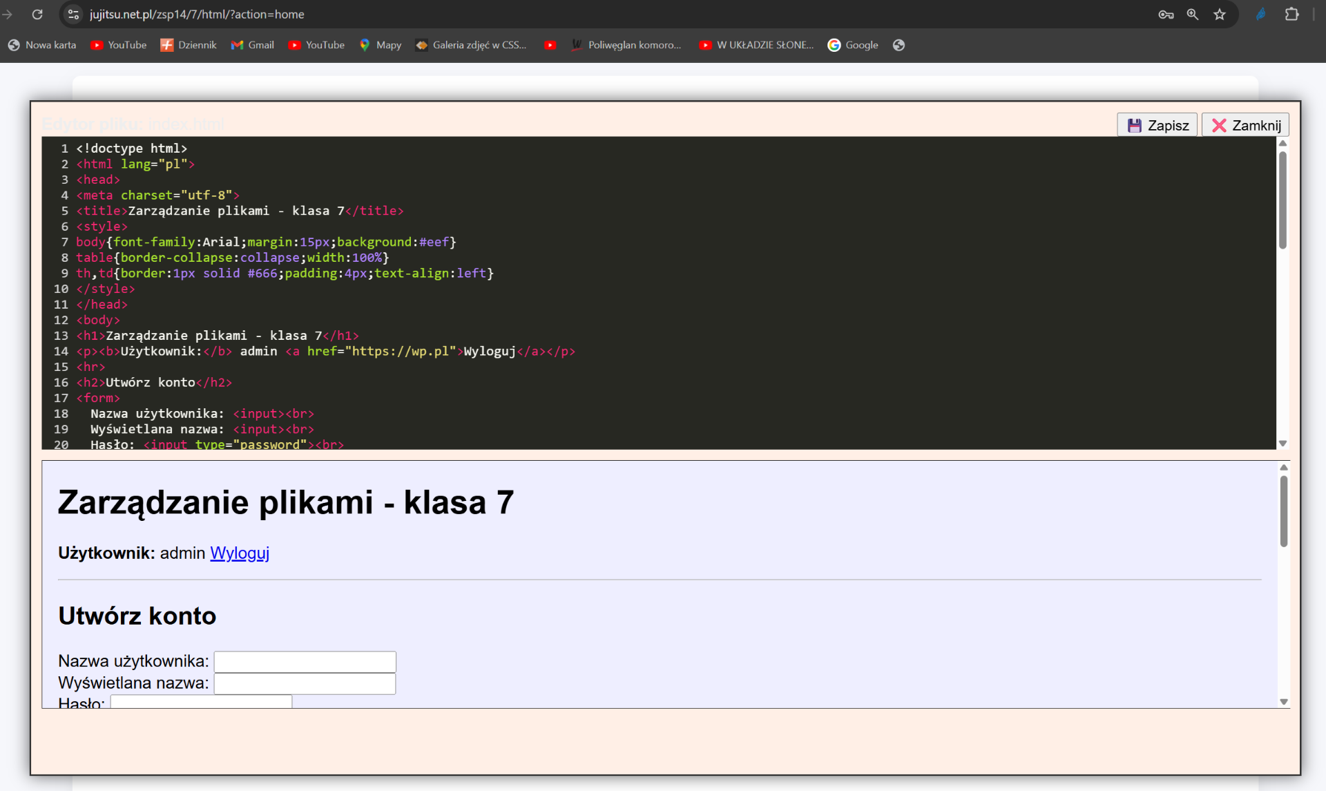 <strong>Zdjęcie nr 2.</strong>to Widok edycji pliku z kolorowaniem składni. Uczeń może obserwować zmianę po kliknięciu przycisku <em>„Zapisz”</em> pod kodem.