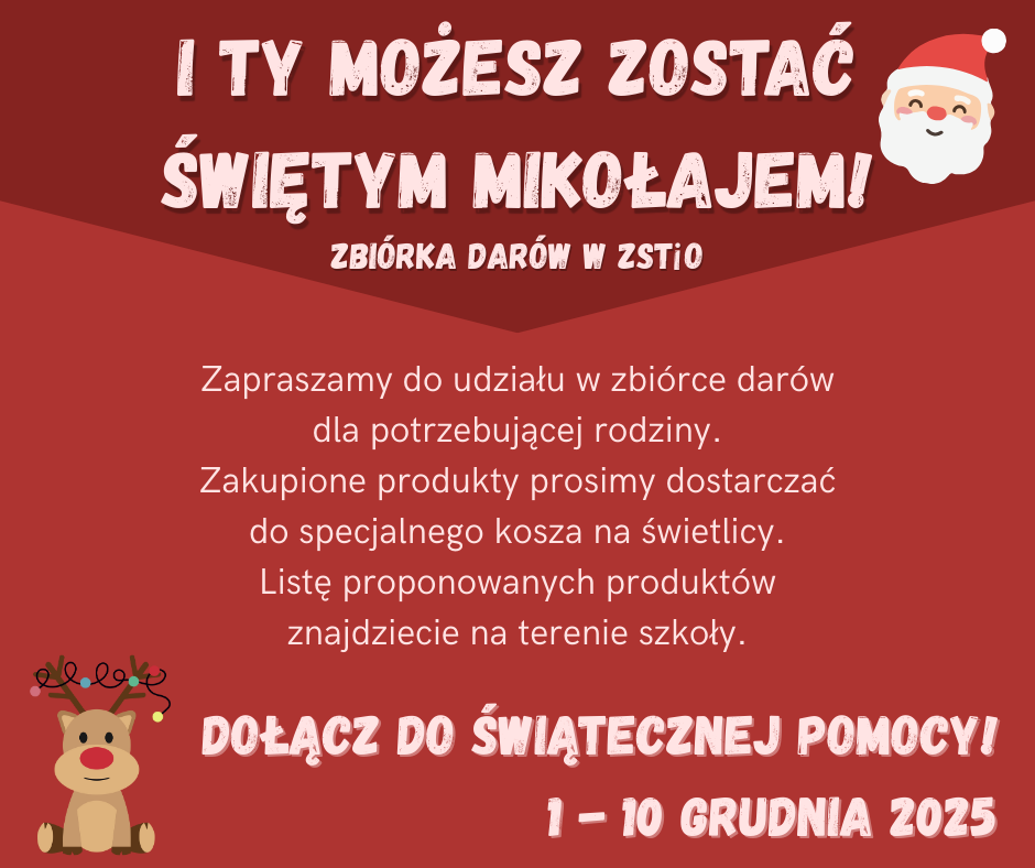 📢Od 1 do 10 grudnia 2025 w naszej szkole rusza świąteczna zbiórka darów dla potrzebującej rodziny.🎅🎁💝